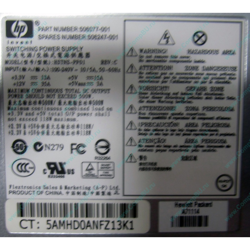 Корпус (case): серверный корпус HP (высота 1U), установлен блок питания 500W HP HSTNS-PF01 (p/n: 506077-001, s/n: 506247-001)